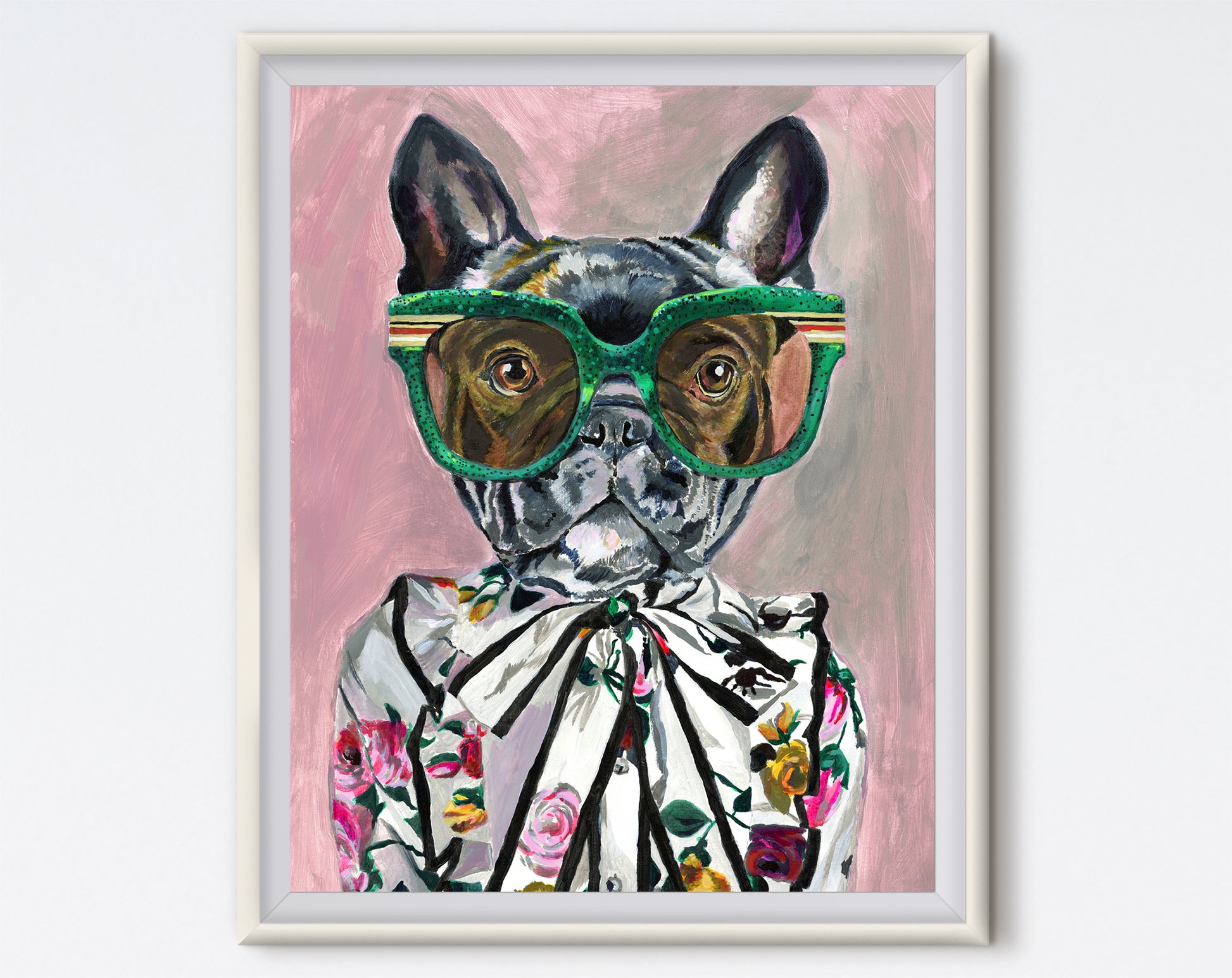 This portrait of a French bulldog wearing Gucci is a reproduction of one of my acrylic paintings.