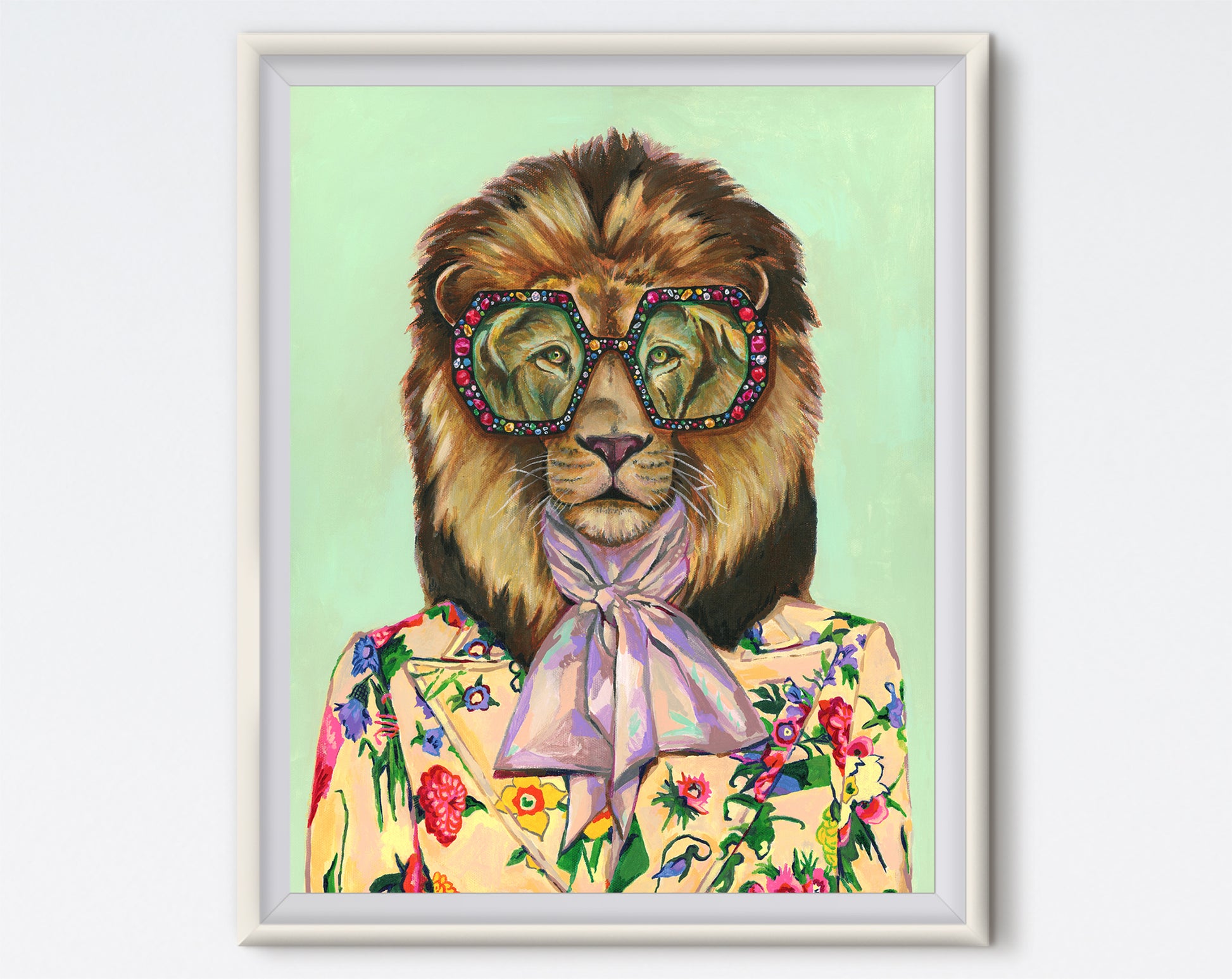 This portrait of a lion wearing Gucci is a reproduction of one of my acrylic paintings.