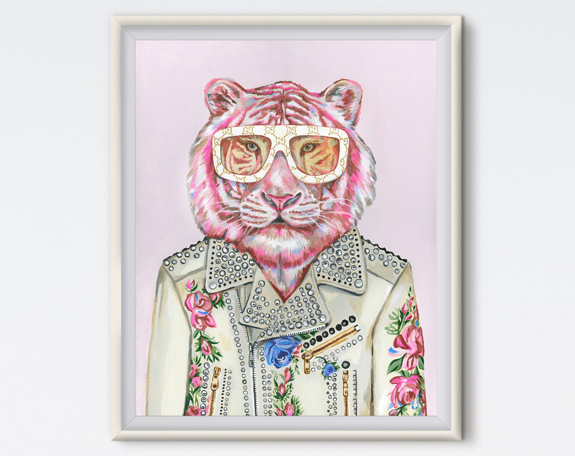 This portrait of a pink tiger wearing Gucci is a reproduction of one of my acrylic paintings.