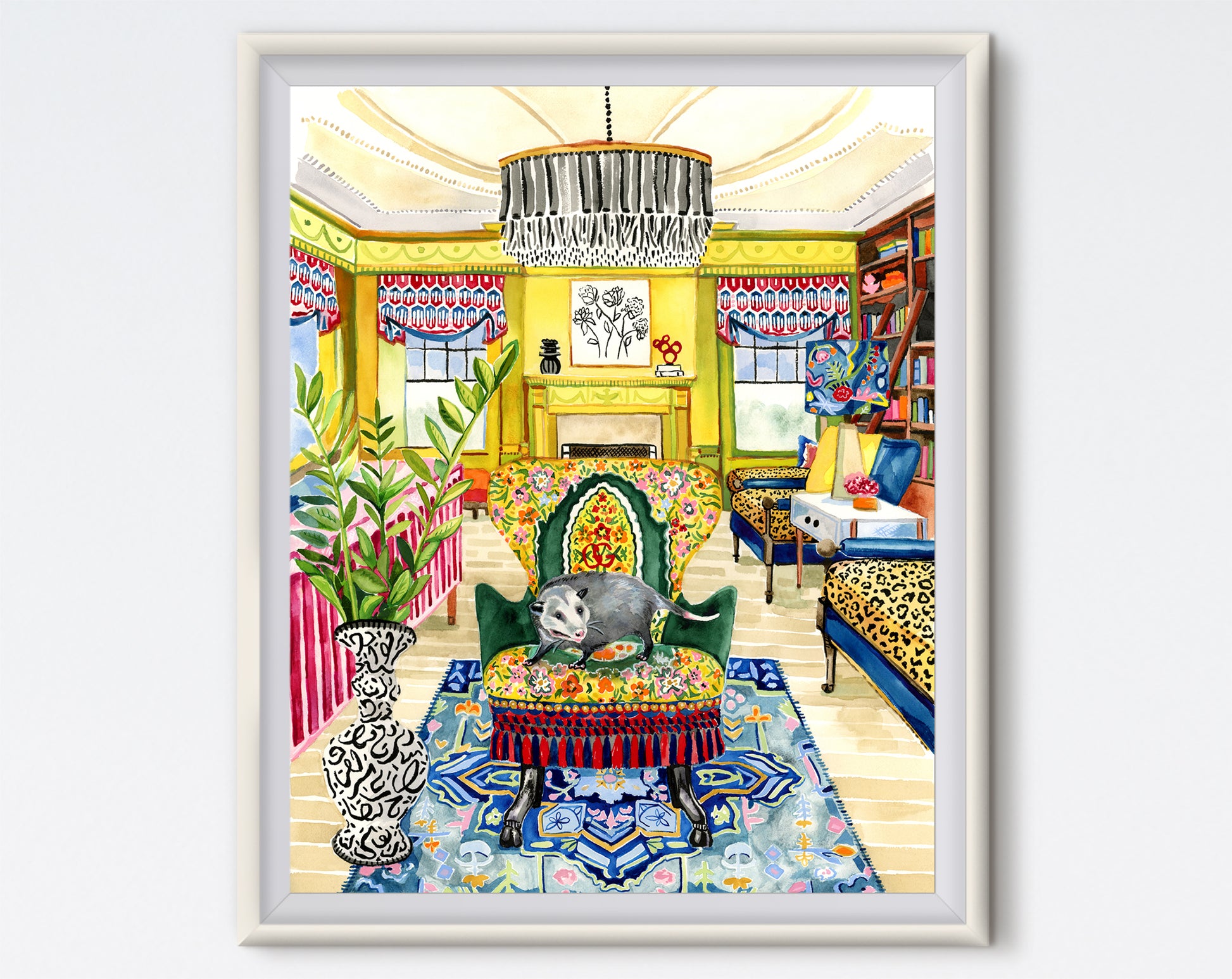 Reproduction of my watercolor painting of a possum in a very posh room.