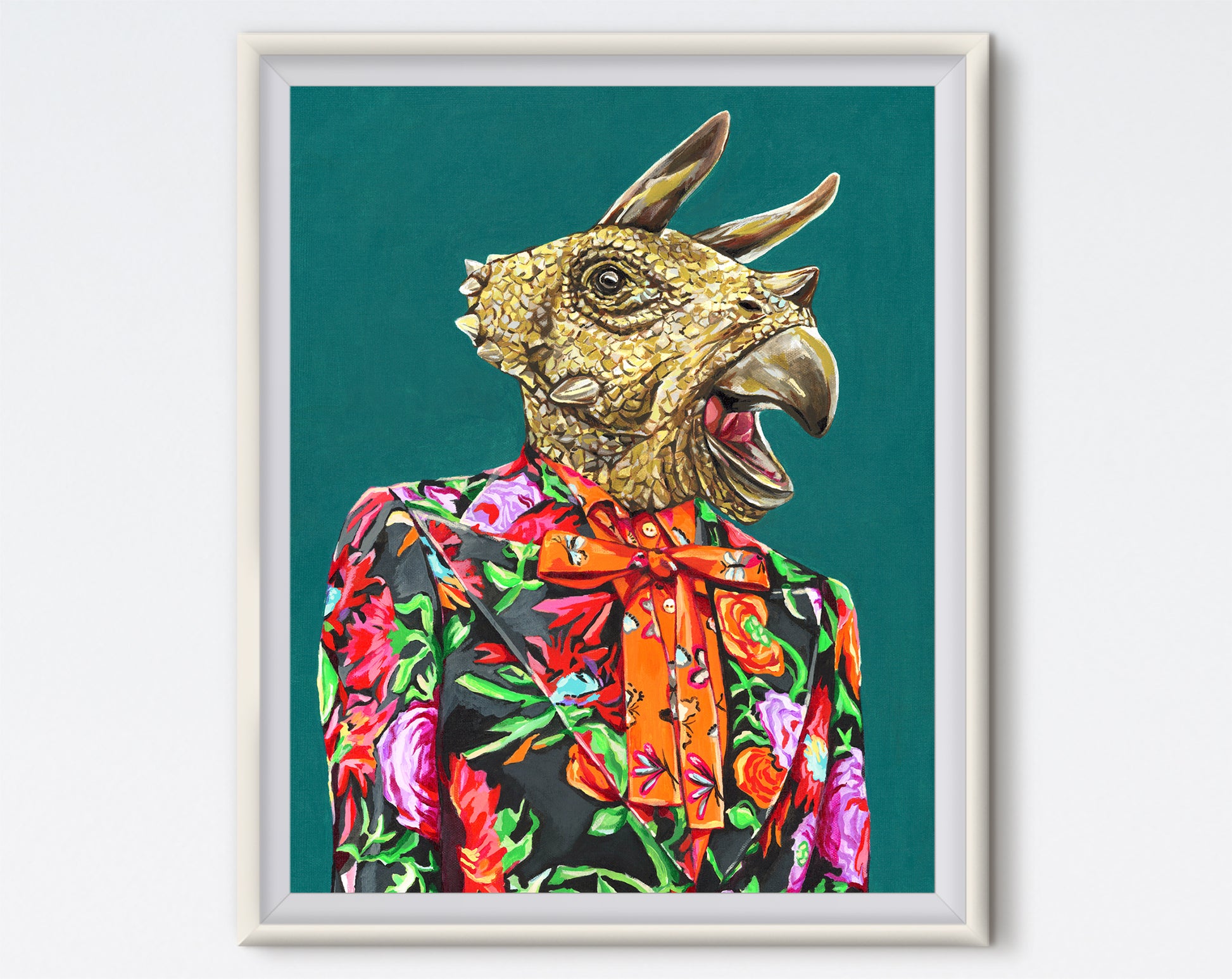 This portrait of a Triceratops wearing Gucci is a reproduction of one of my acrylic paintings.